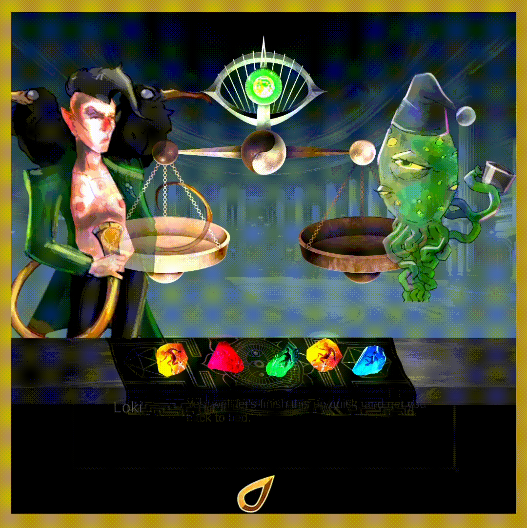 In this puzzle game the player must sort gems between two different gods. Each god has a different preference for different color soul gems, so a red gem on one god's side might be worth 1, but on the other god's side could be worth more. The goal is to find a configuration such that the scales are balanced Players are rewarded with scenes of dialogue between characters.